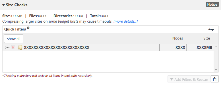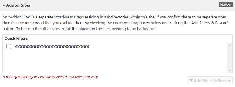 Duplicator detects if there are WordPress sites in subdirectories within the website files. The Quick Filters area allows excluding these Addon Sites from the backup.