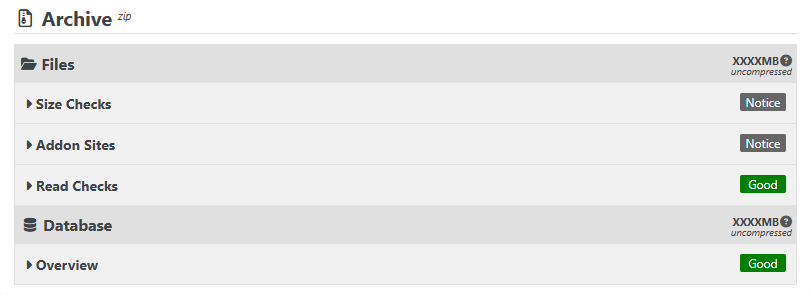 This section provides information about the database and its tables, including the database size, total row count, and the row count and size for each database table included in the backup.
