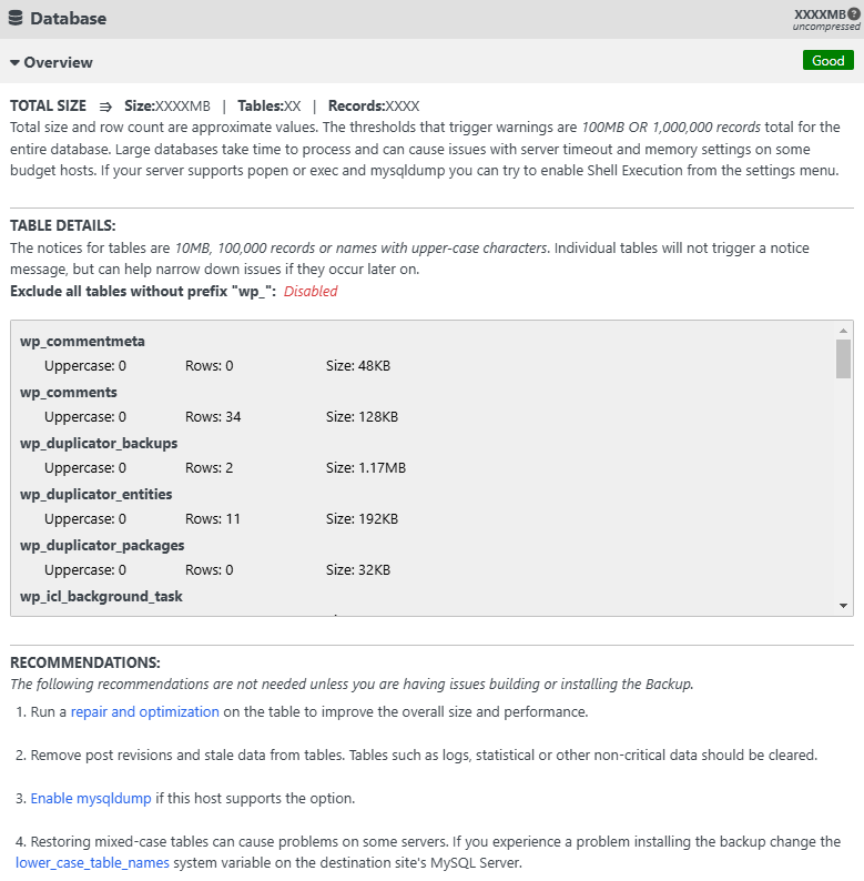 The total size and row count are approximate values. Warnings are triggered if the database size exceeds 100 MB or if the total number of records exceeds 1,000,000. Large databases may take time to process and can cause issues with server timeouts and memory settings, particularly on some budget hosts. If issues arise and your server supports popen, exec, and mysqldump, you can try enabling Shell Execution from the settings menu.