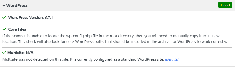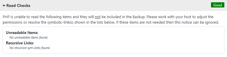 After the scan has run, you will see a report status of either “Good” or “Notice”. Scan checks with a “Notice” will not prevent the build from running; however, if you do run into any backup build issues, then it’s possible the “Notice” should be investigated. If you receive a notice and are not sure how to proceed, we recommend proceeding with the notice and seeing if the backup builds. Below is a list of the scanner sections with details on how to proceed.