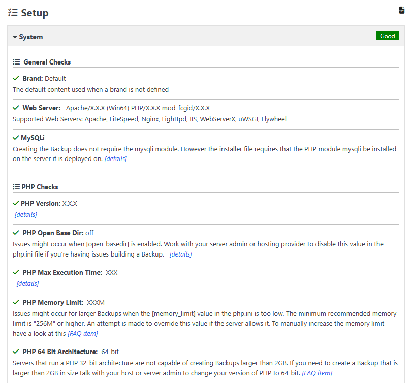 The System area consists of various test for your Web Server, PHP, and hosting environment. If you run into an issue in this section, there should be details on how to properly proceed with each notice.