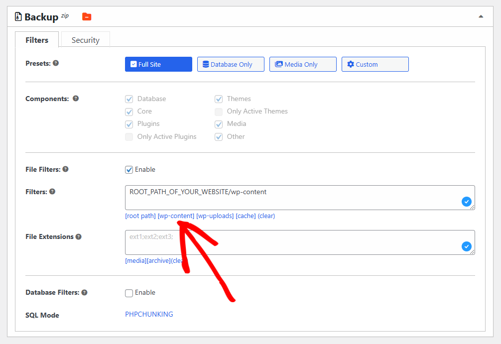 - Locate Backup » Filters, and enable the setting File Filters